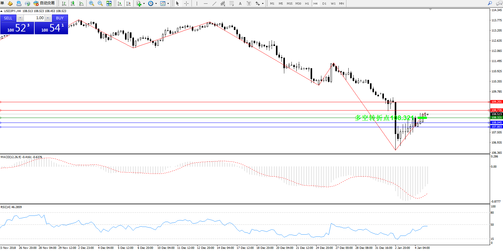 美元日元USDJPY——4小时K线图显示: