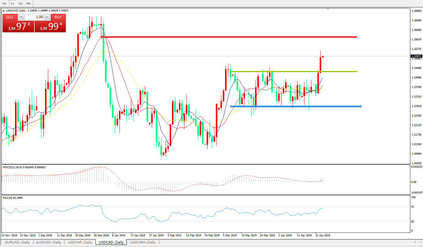 加拿大央行公布了4月利率政策决议,维持利率水平在1.75%不变,但取消了今年的加息预期。此外,加拿大央行将2019年GDP增长预期降至1.2%,此前为1.7%,并且将中性利率区间预估自2.5~3.5%降至2.25~3.25%。加拿大央行行长波洛兹表示,经济增长低于趋势水平将是暂时性的,预计下半年会得到提振。他认为加拿大原油进入全球油市的程度有限,这是一个明显的负面因素,并且带来不确定性。加拿大央行的鸽派论调引发加元急跌,美元兑加元急速拉升。