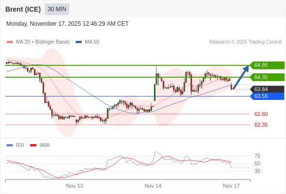 在 63.55 之上,看涨,目标价位为 64.35 ,然后为 64.85 。