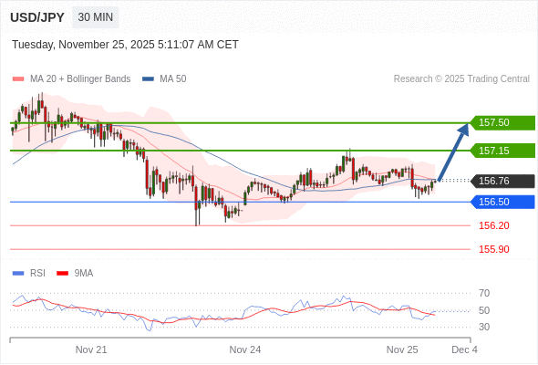 在 156.50 之上,看涨,目标价位为 157.15 ,然后为 157.50 。
