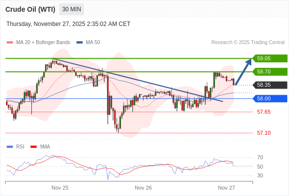 在 58.00 之上,看涨,目标价位为 58.70 ,然后为 59.05 。