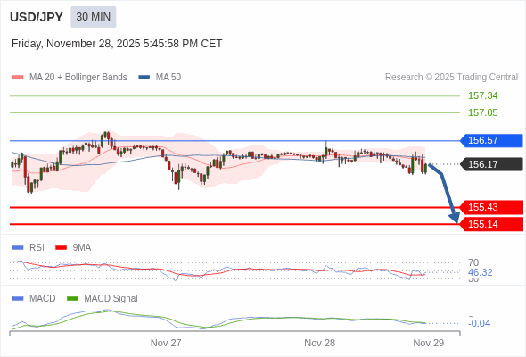 美元/日元 当日内 : 看跌,在 156.57 之下。