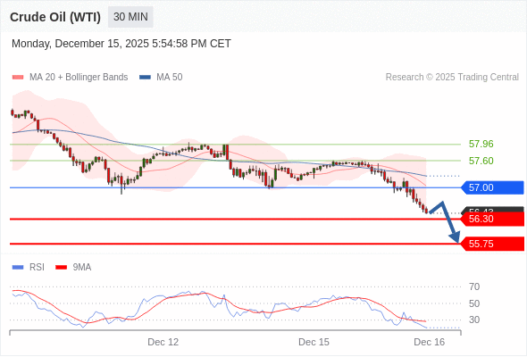 交易策略: 在 57.00 之下,看跌,目标价位为 56.30 ,然后为 55.75 。