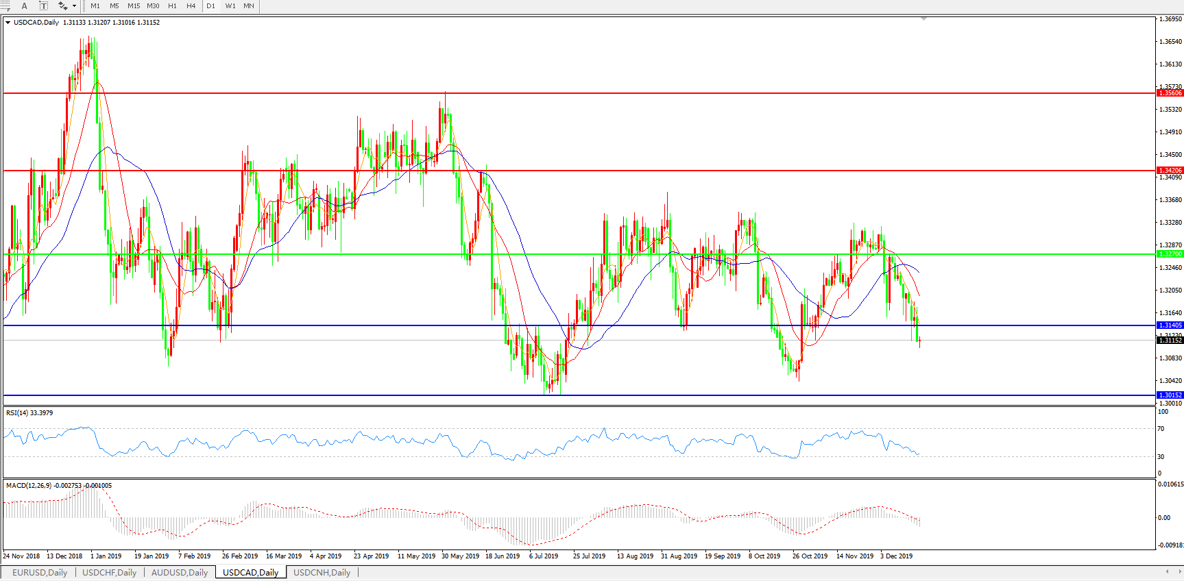 技术面简析:日线图均线呈空头排列,汇价持续震荡走弱逼近1.3140关口,MACD下穿0轴且量能0轴下方微放量,RSI持续走低,短期下破1.3140附近支撑,预计汇价存进一步下行空间。