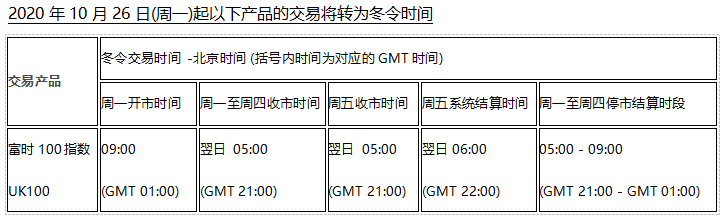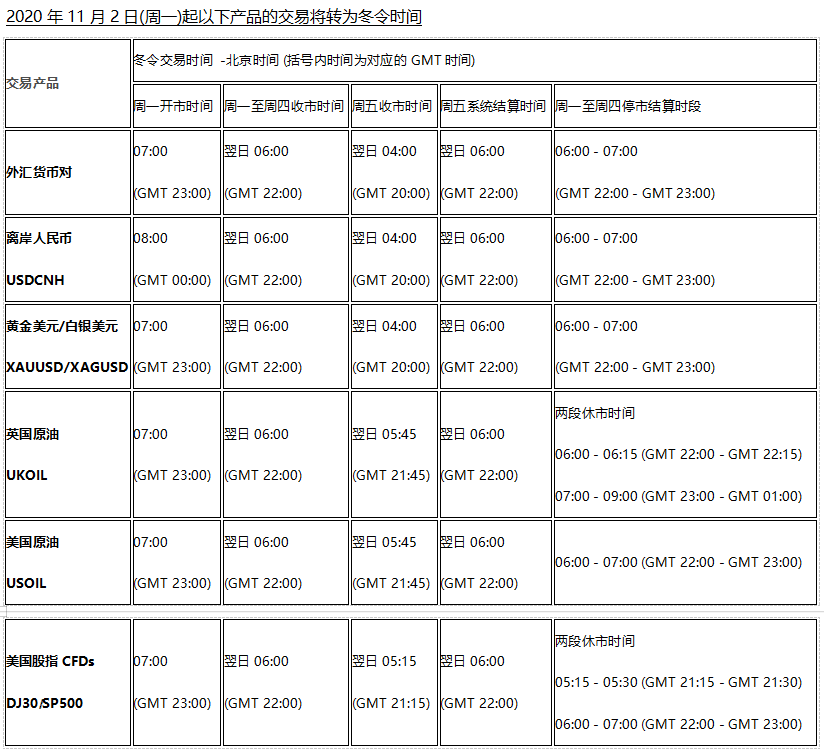 因应欧洲市场将于20201026()北美市场2020112()开始分别转冬令时间, 以下欧美市场各产品交易时间将调整为冬令时交易时间,敬请阁下留意知悉