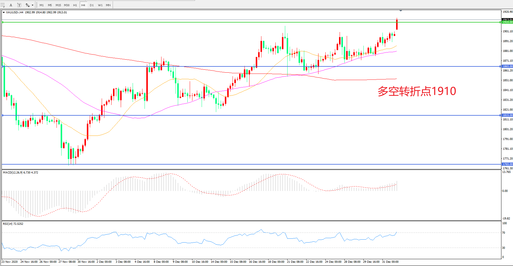 4小时图看,金价阳线连续拉升,短期走势偏强,1910阻力被突破,55周期均线形成下方支撑, MACD红柱增加,RSI指标走平,日内延续上行概率较大。