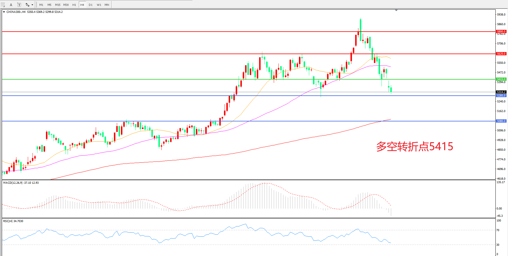 交易策略:在5415.00之下看跌,目标5285.00    5080.00