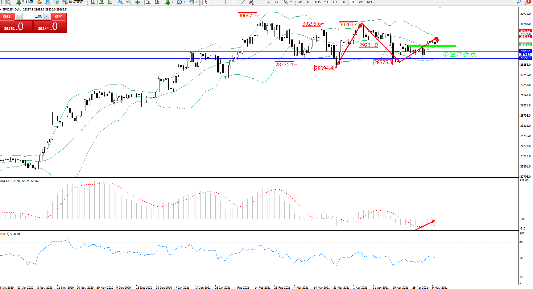技术点评:长时间维持在布林带指标通道内处于宽幅震荡走势中,空头动力司机入场跌破布林带指标下轨附近节点后不断向下移动中,低位抵达28375附近得到短暂支撑多头伺机入场,反转回升后整理平移后,触及布林带指标中轨附近节点,破位强势拉升,进入中上轨区间向上移动,布林带指标呈张口走势后开始收口,MACD指标处于0轴线下方维持震荡平移,RSI指标空头动力弱势纠结于50均衡线附近弱势整理后回升;