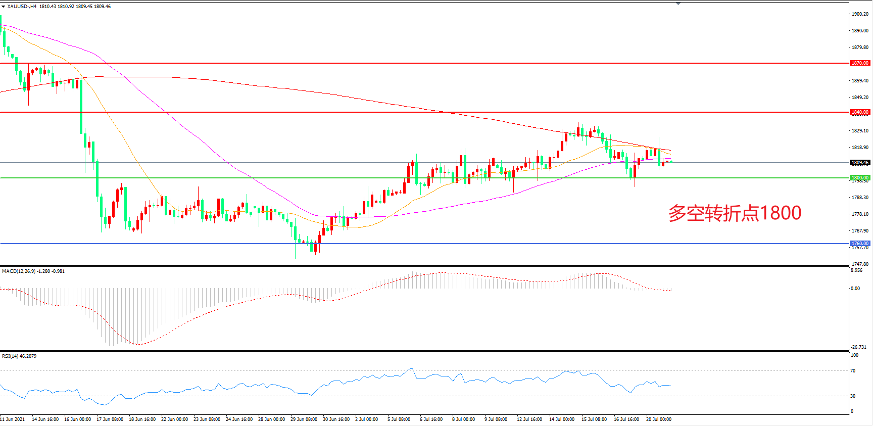 4小时图看,金价回踩1800支撑后再度冲高,但受制于200周期均线出现回落,整体走势偏强,MACD红柱增加,RSI指标走平,日内震荡向上概率较大。
