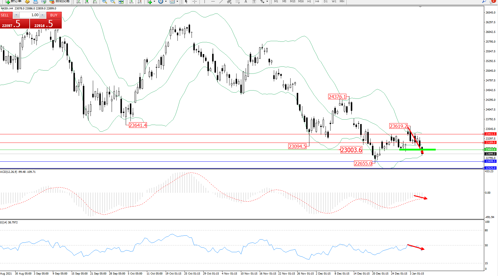 技术点评:空头动力持续震荡下挫,再度触及布林带指标下轨附近节点,短期空头动力有继续下行态势,布林带指标呈收口走势持续平移后有向下移动迹象,前期低位22655位置近在咫尺破位在即,MACD指标处于空头区域维持整理缓慢上移后开始徘徊,有下行迹象,RSI指标处于50均衡线下侧弱势震荡向下移动中;