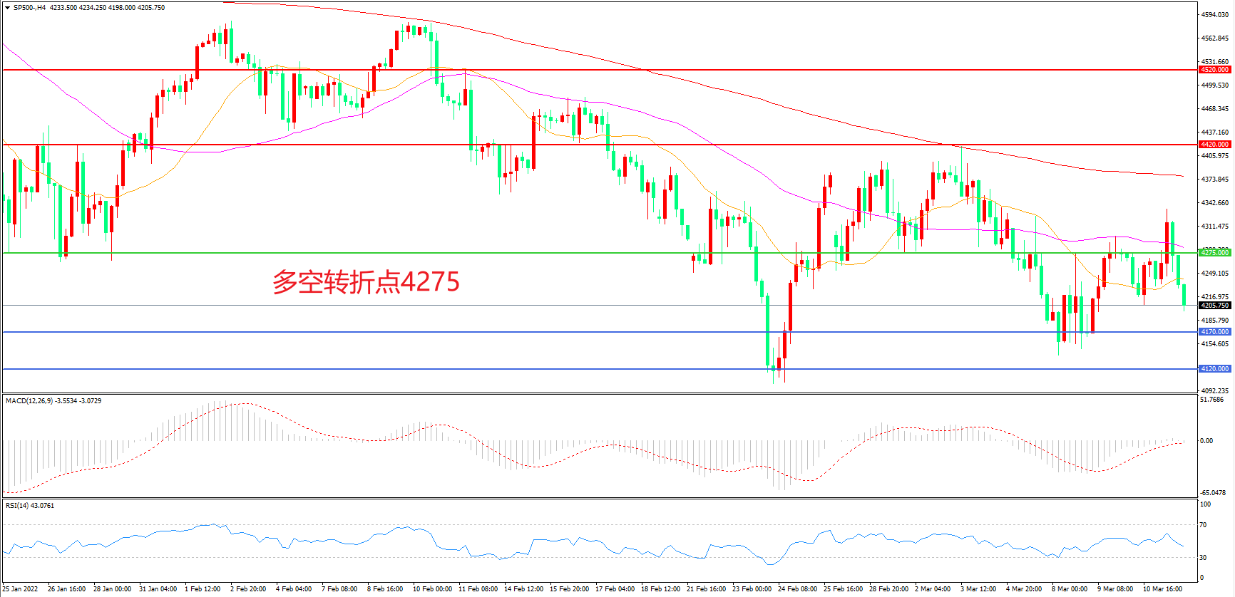 上周五(3月11日),俄罗斯总统普京表示俄乌会谈取得某些积极进展,后央视报道,美国宣布将取消对俄罗斯的最惠国待遇,标普500高开低走,收报4205.75点。近期美股三大指数大幅下挫表明市场已经开始消化企业获利受到战争影响的预期,但预测数据显示美联储本月进行加息以对抗通胀几乎成定局,“滞胀”担忧的情绪影响下,美股延续下行概率较大。