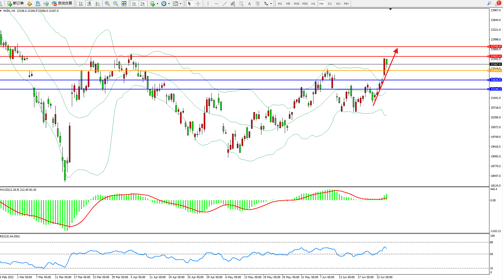 香港恒生指数6月27日(周一)收盘上涨510.46点,涨幅2.35%,报22229.52点;港股全天表现强势,恒指、恒生科指分别收涨2.35%及4.71%,双双重上22200点和5000点大关。午后虽在腾讯转跌中大市一度涨幅收窄,但总体依旧强势。大型科技股全天强势,小米大涨12.44%,京东涨超6%。