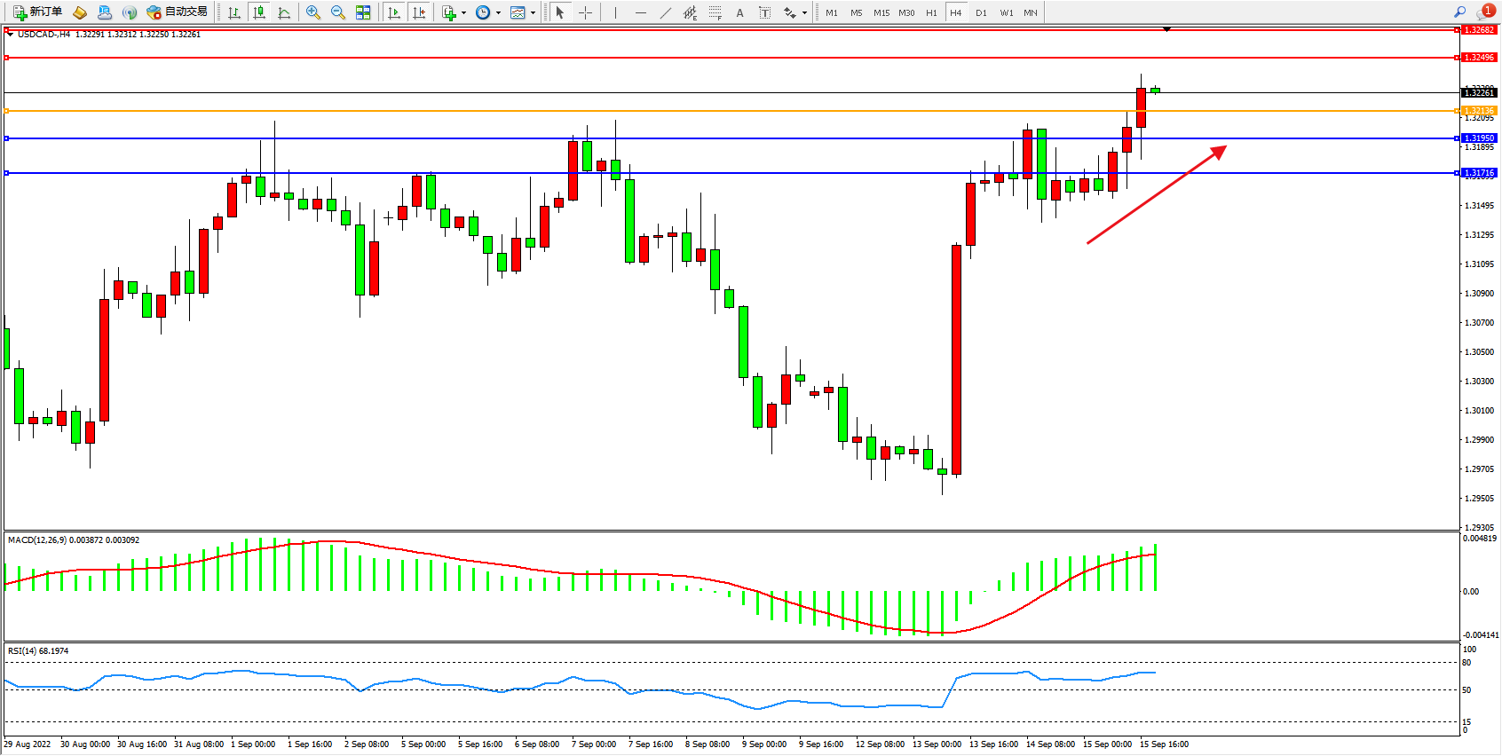 美元加元USDCAD——4小时K线图显示: