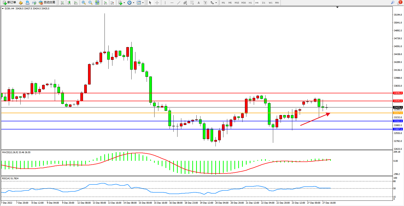 道琼斯指数12月27日(周二)收盘上涨37.70点,涨幅0.11%,报33241.63点;美国11月批发库存数据:库存的增加对第四季度的GDP是积极的,但库存的逆转只是时间问题,给2023年第一季度GDP增加了下行风险。此外,零售商继续减少库存。
