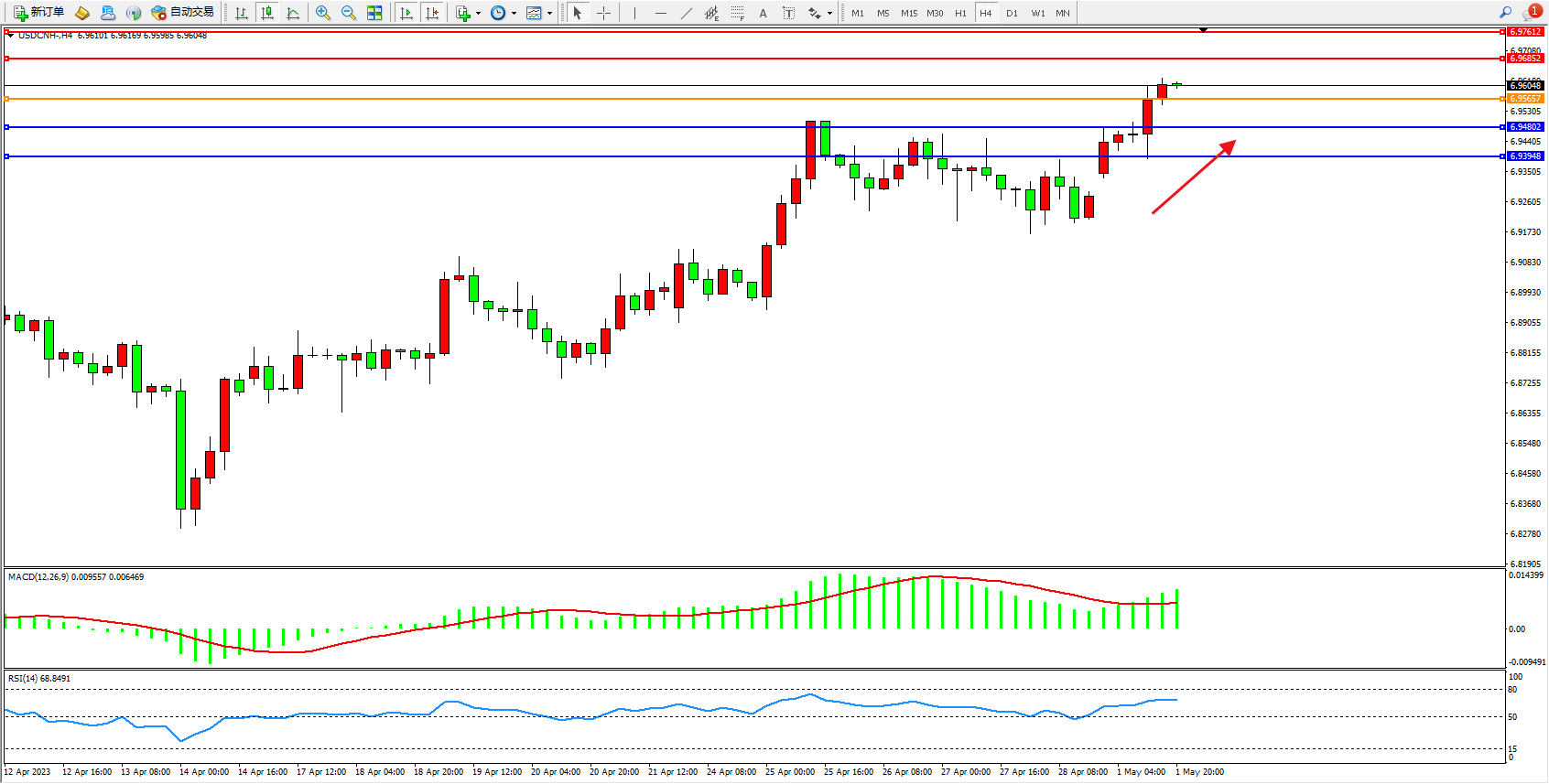 交易策略:6.95657上方看涨,目标6.96852  6.97612