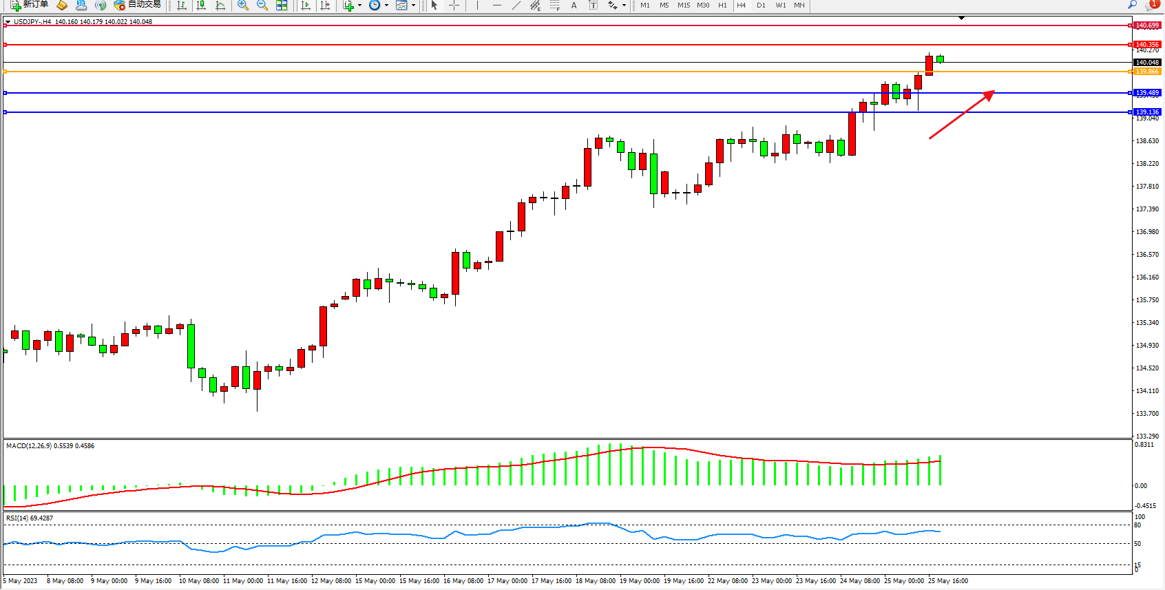 4小时图看:高位多头动力不断向上移动,短期看涨情绪笼罩,市场多头不断攀升中,MACD指标处于多头区域维持整理,RSI指标处于多头区域维持徘徊;