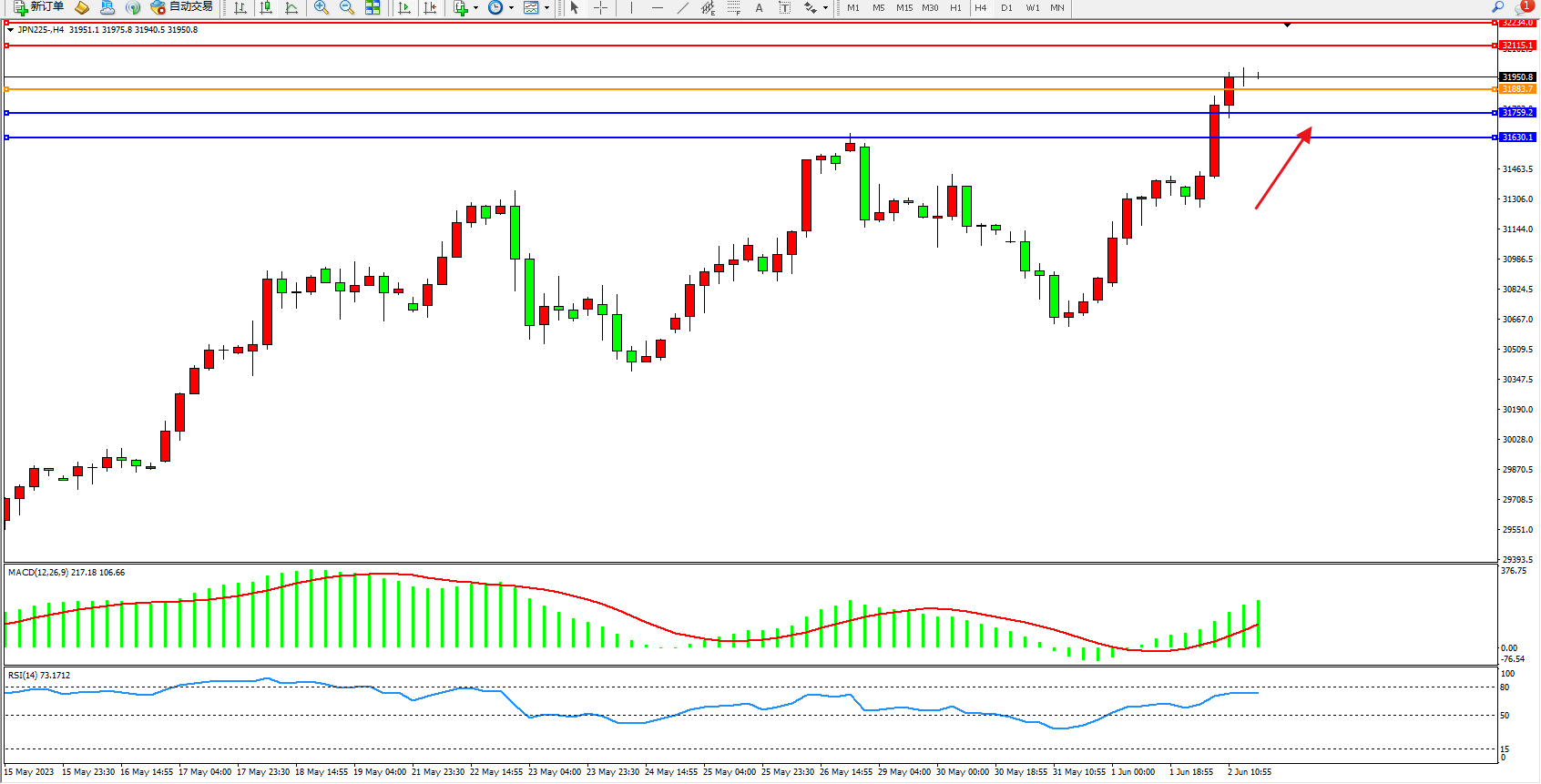 日经225指数6月2日(周五)收盘上涨384.49点,涨幅1.23%,报31532.50点。日本经济在第一季度摆脱了衰退,因为疫情后的消费反弹抵消了全球的不利因素,支撑了持续复苏的希望。日本4月经常帐收支会保持盈余状态。4月经常帐收支的预估中值为盈余1.6638万亿日元(120亿美元)。