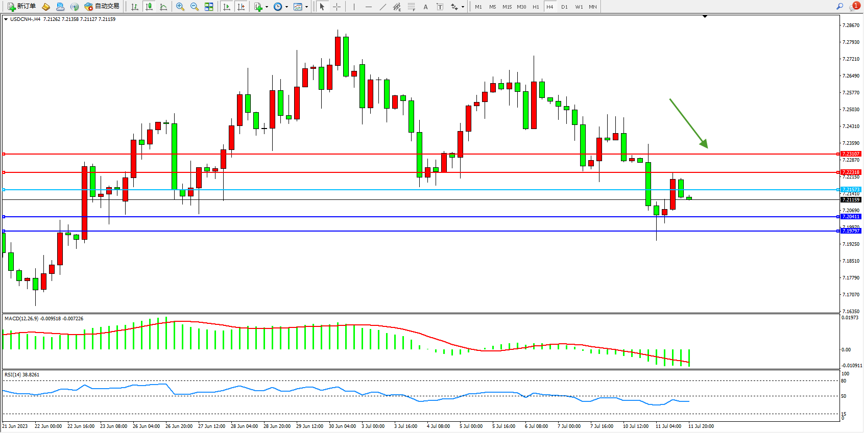 美元人民币USDCNH——4小时K线图显示: