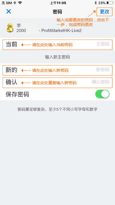 4.分别在当前、新的、确认框输入对应密码,然后点击右上角[更改]进行提交修改。