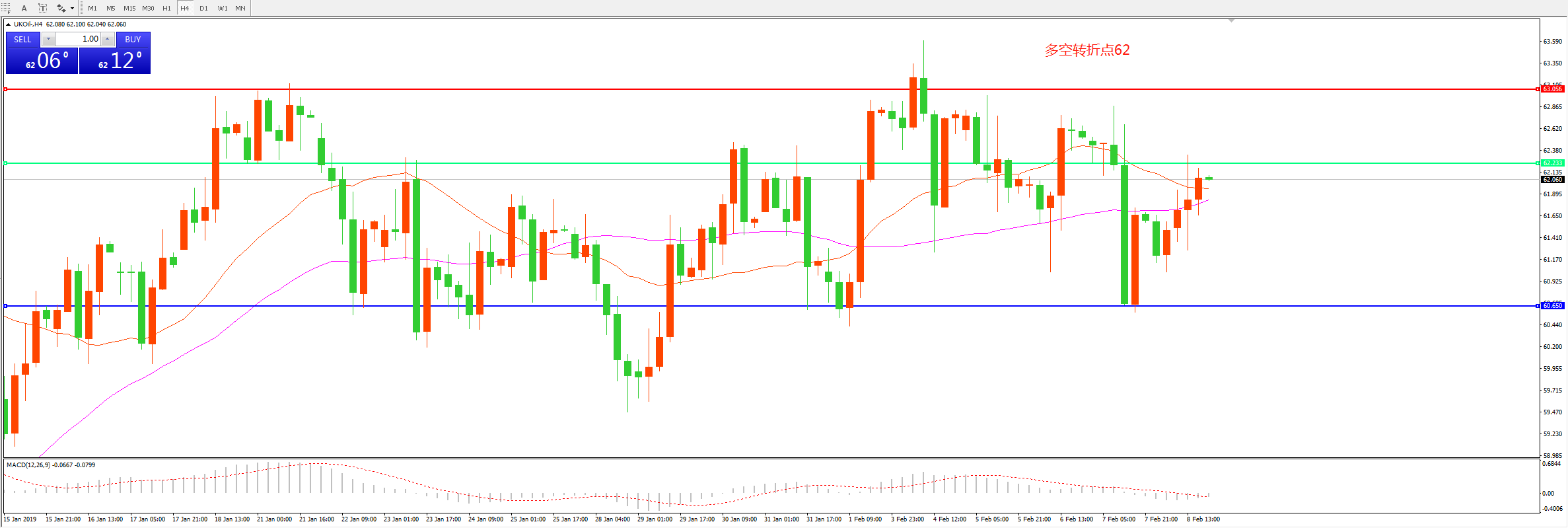 4小时图看,油价处于窄幅震荡形态,短期整理后受制于62美元, 均线系统逐渐粘合列, MACD红柱减少,日内存在一定下行压力。